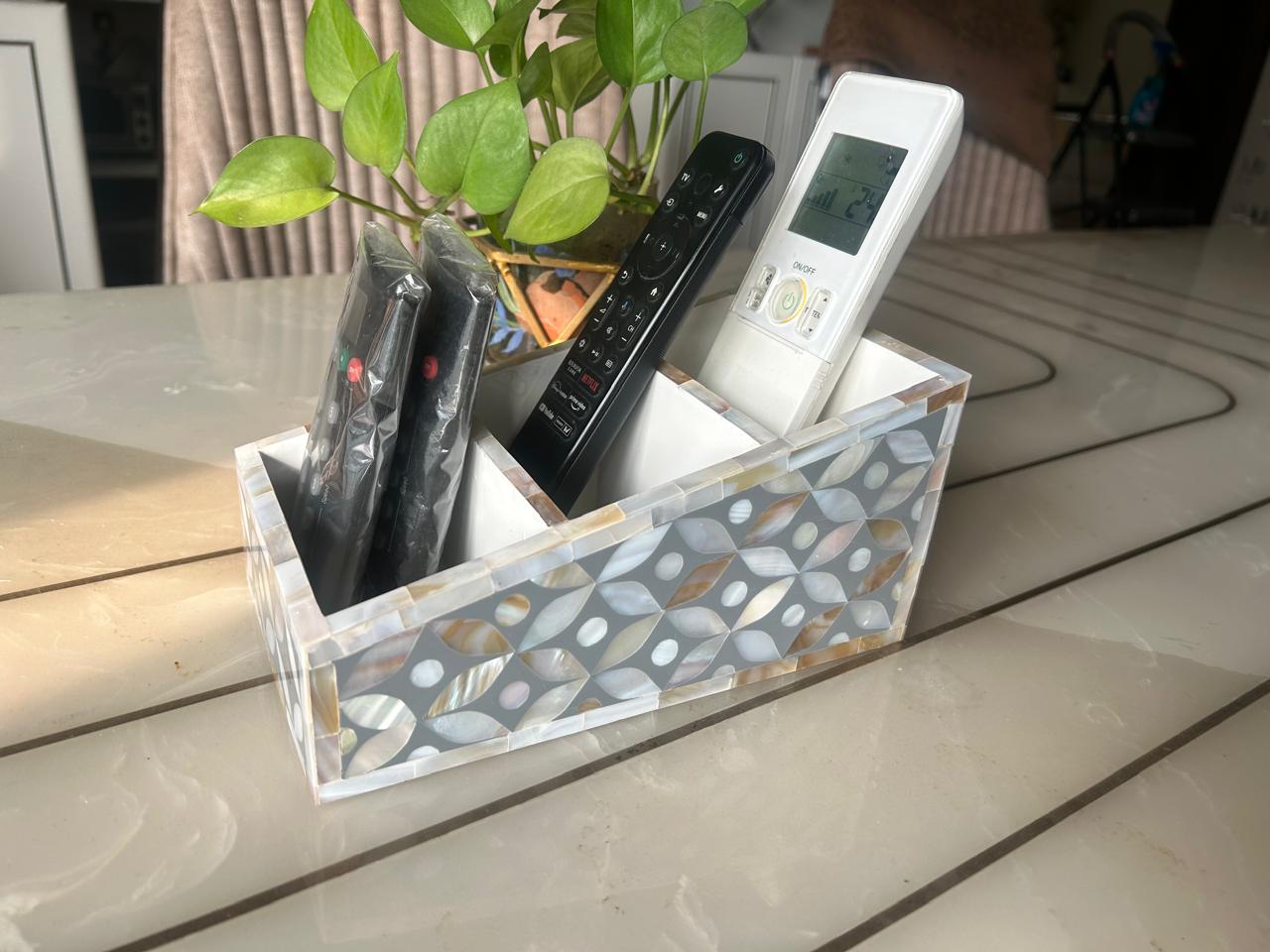 No more hunting for misplaced remotes � meet the Ethereal Mother of Pearl Remote Stand, where organization meets art. Designed to bring order and beauty to your living space, it keeps your remotes, pens, or spectacles neatly arranged. Each piece is delicately hand-inlaid with Mother of Pearl, radiating a soft sheen that speaks of quiet luxury. A statement accessory for homes that value elegance in every detail.