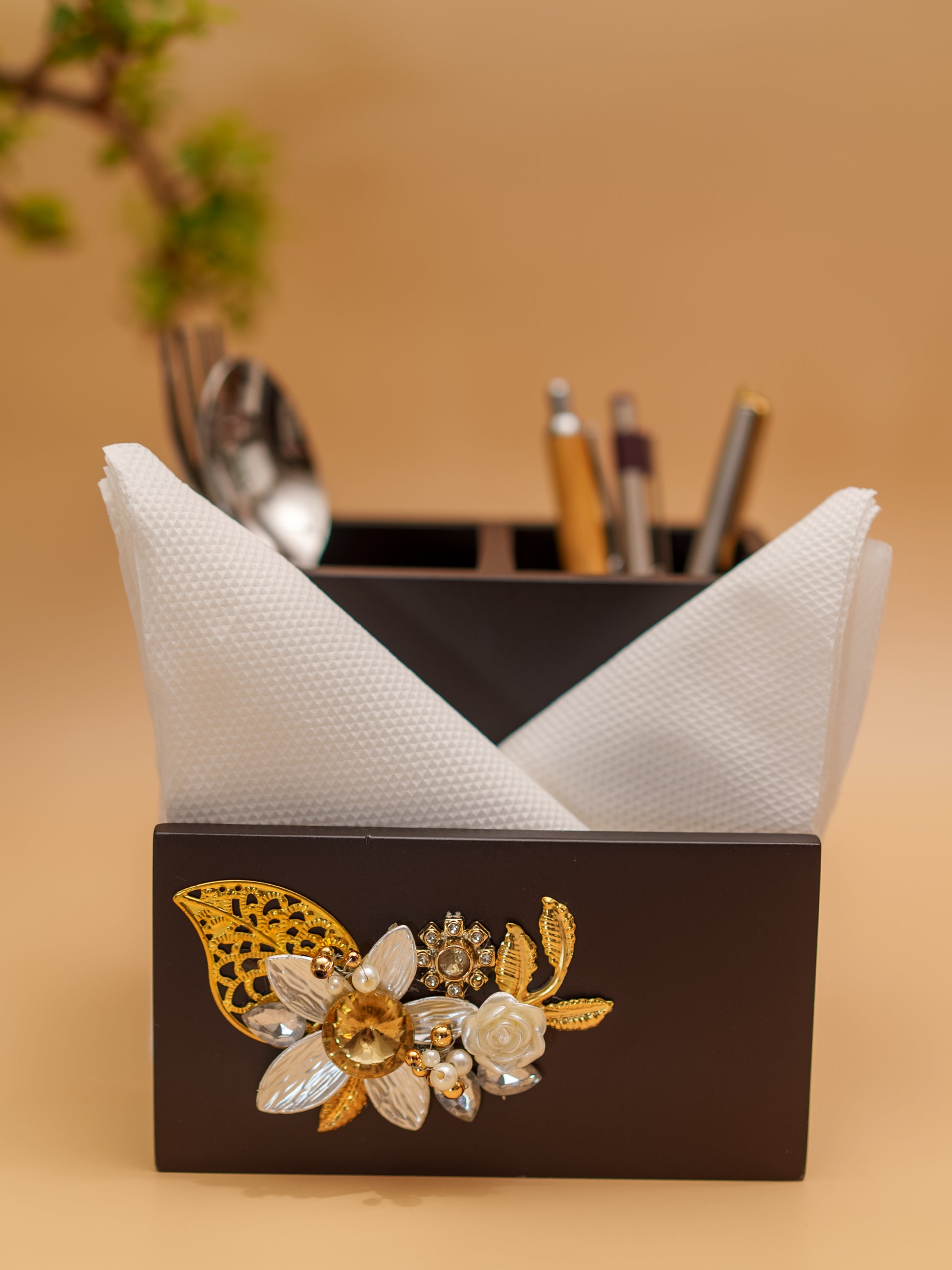 Tired of cluttered dining tables? The Royal Blossom Cutlery & Tissue Holder keeps your utensils and tissues elegantly organized. Handcrafted by the women artisans of India, each piece is unique, showcasing Indian craftsmanship without compromising on luxe. Transform your dining experience into a luxurious affair.